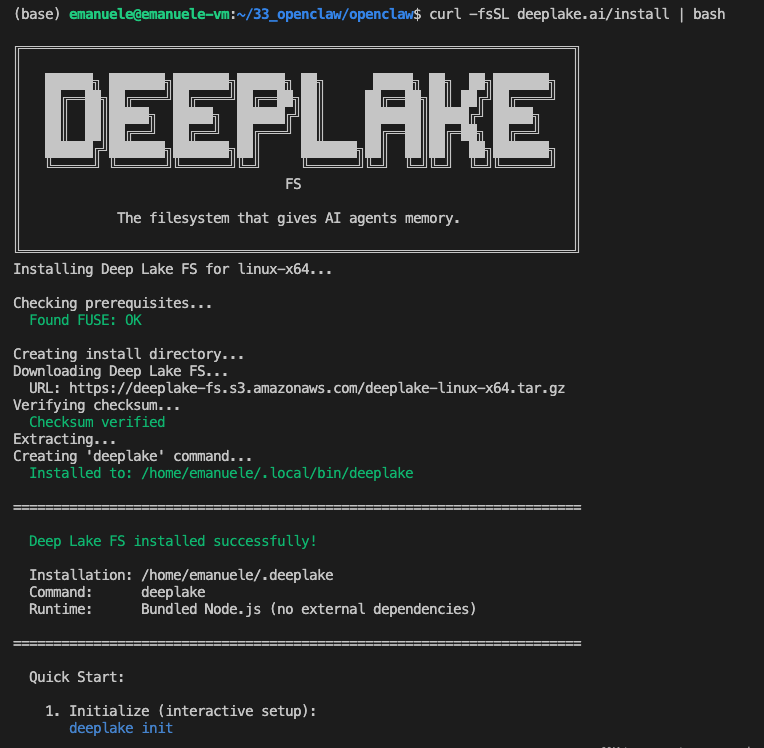 This installs the deeplake CLI to ~/.deeplake/ and creates a symlink at /usr/local/bin/deeplake.