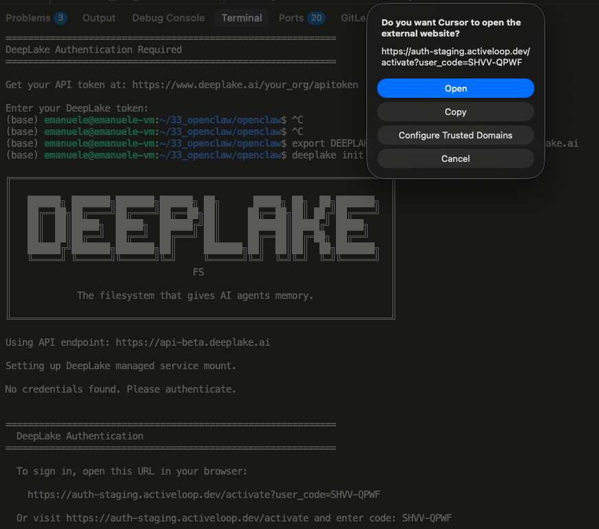 Authentication: the CLI asks you to authenticate. It provides a browser link for OAuth login.